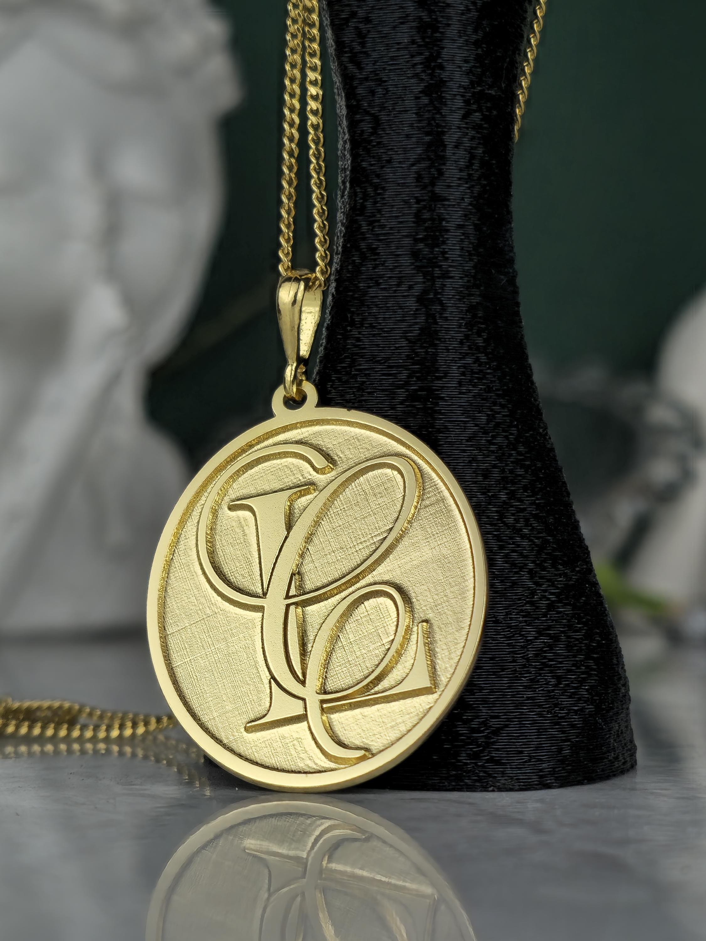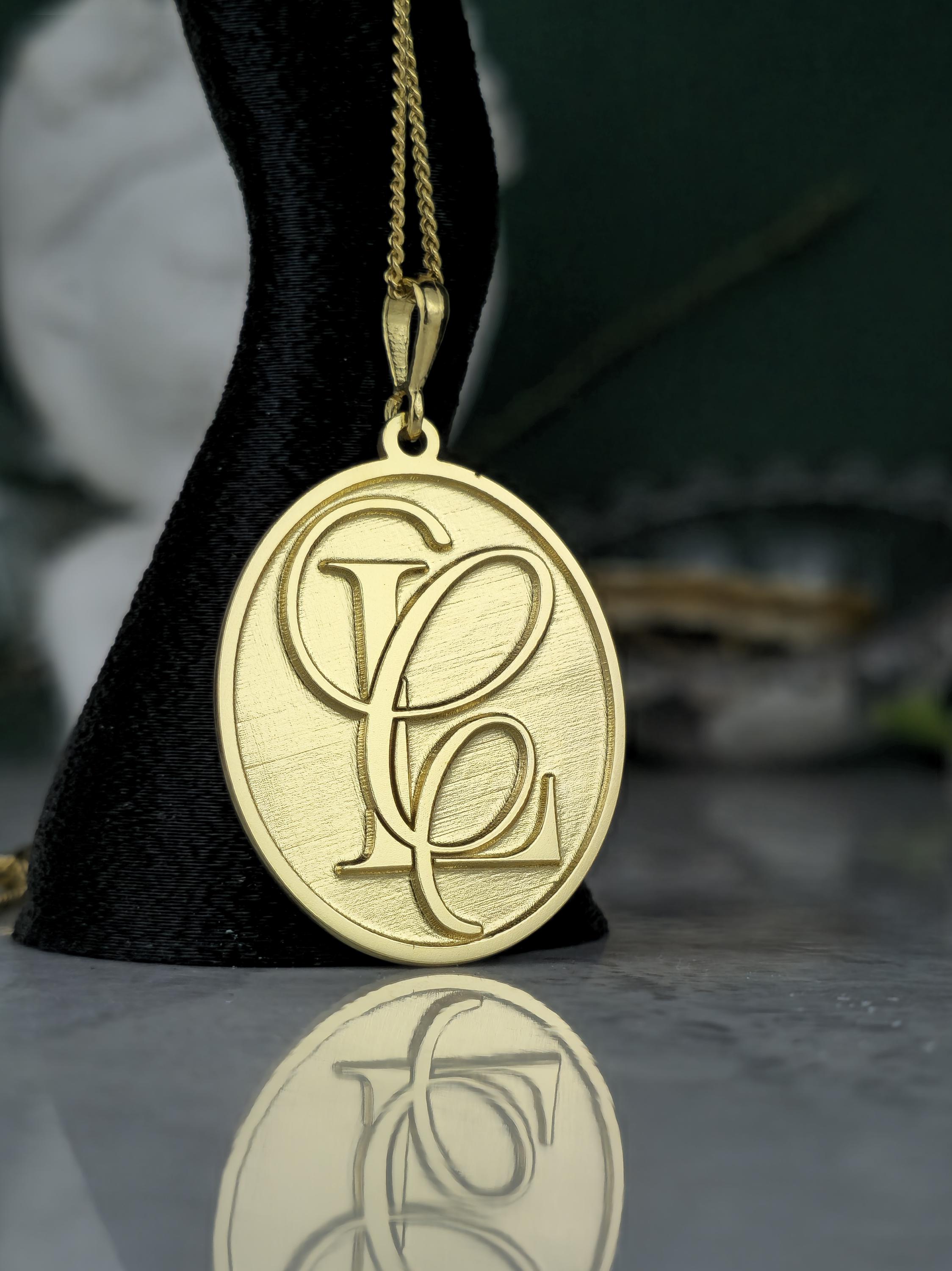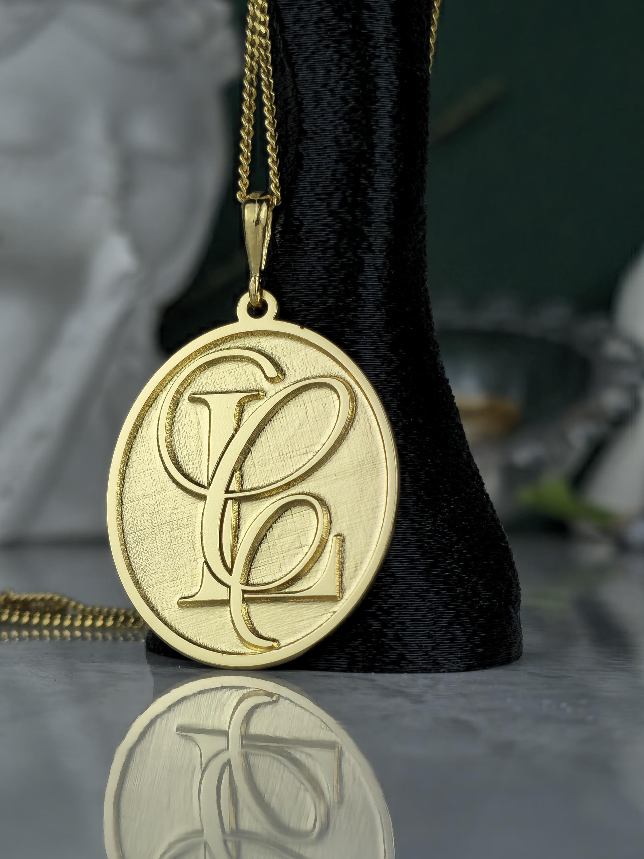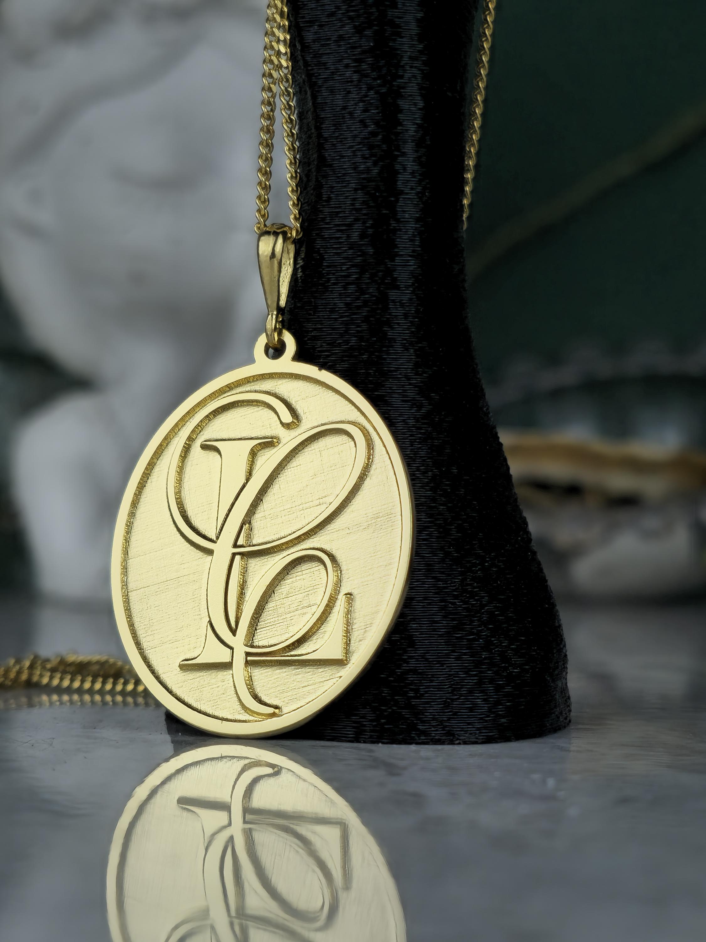 Design: 💖 Elegant oval pendant with intricately designed, intertwined custom initials (e.g., SF, FS). A classic brushed gold finish for a refined look.