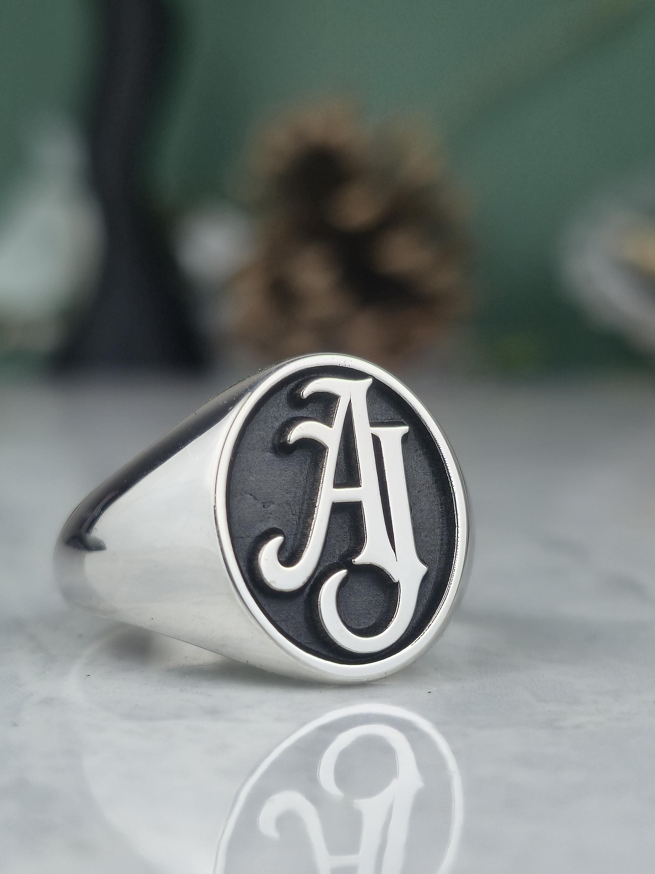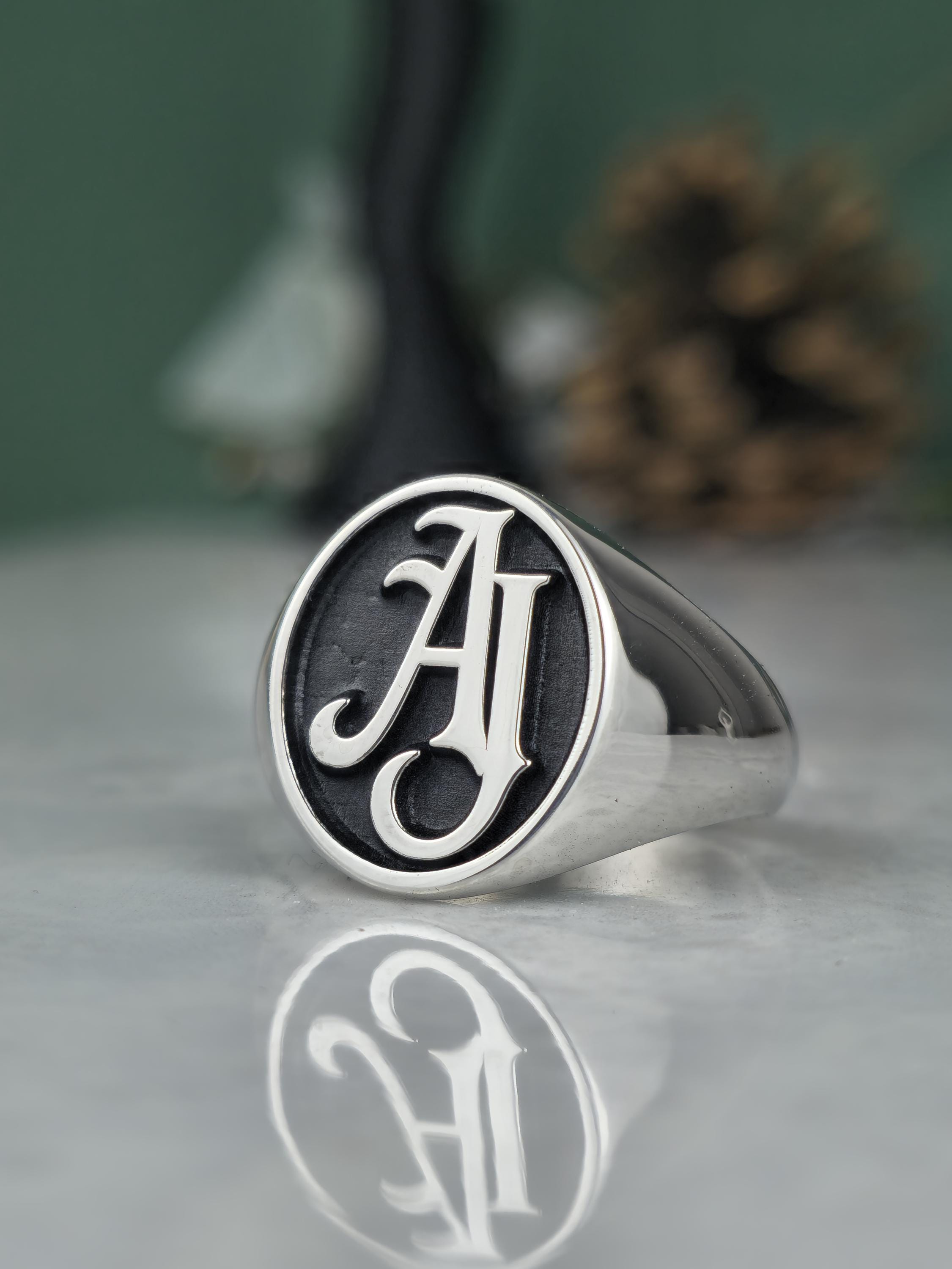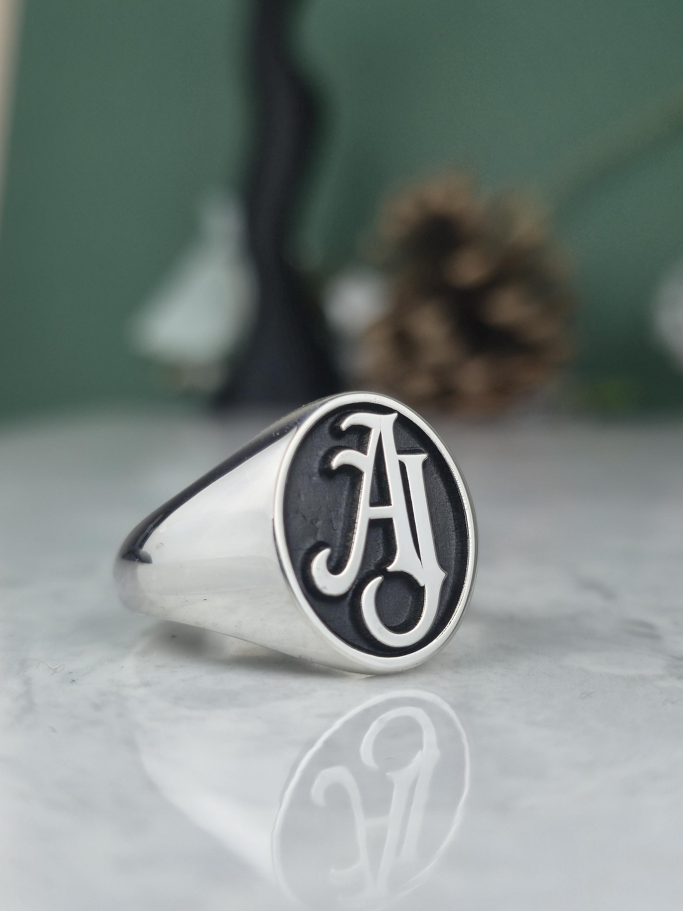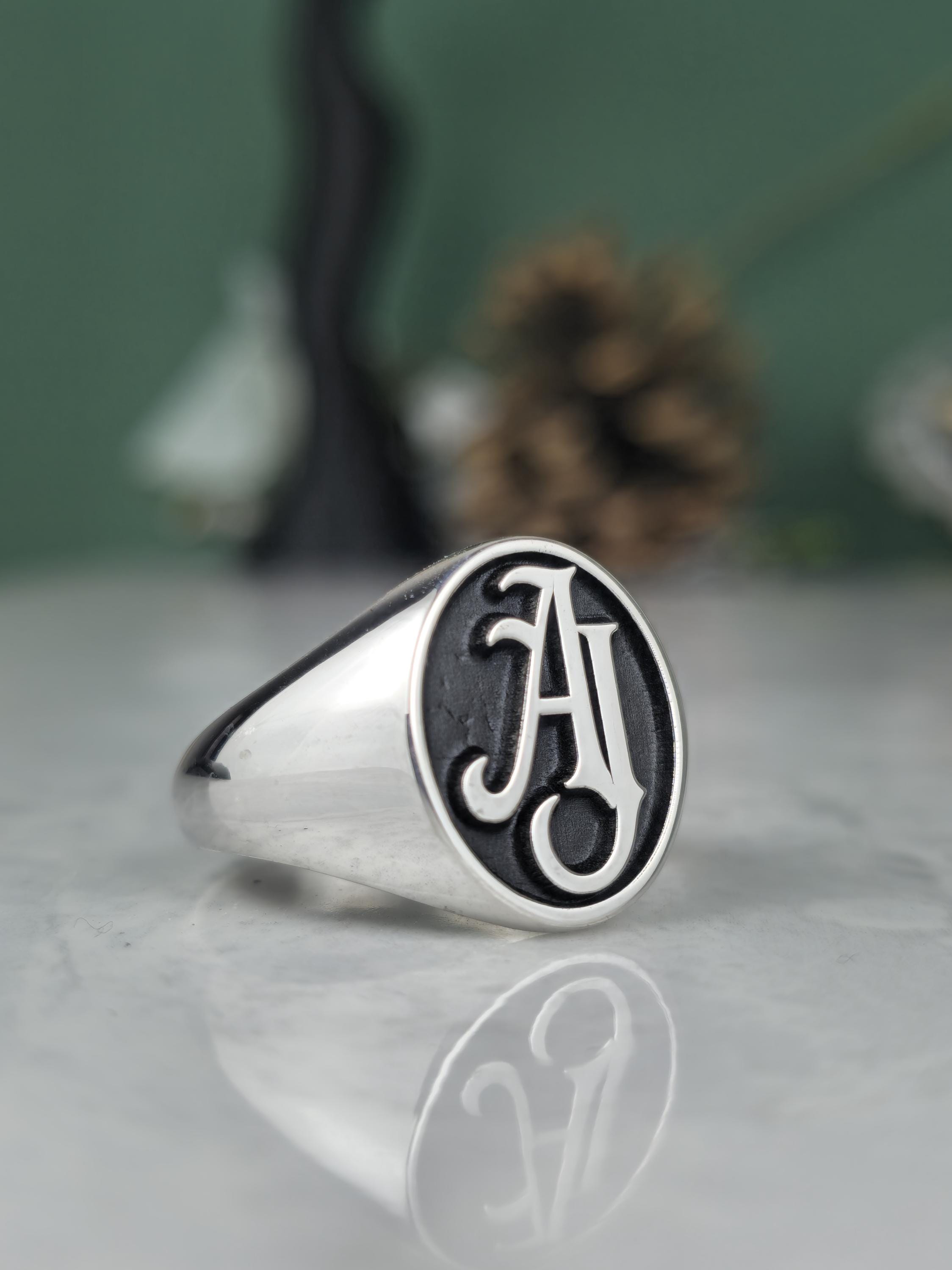 Design: ✨ Classic oval signet face featuring a custom 2 or 3-letter intertwined monogram. The raised silver letters pop beautifully against the black recessed background.
