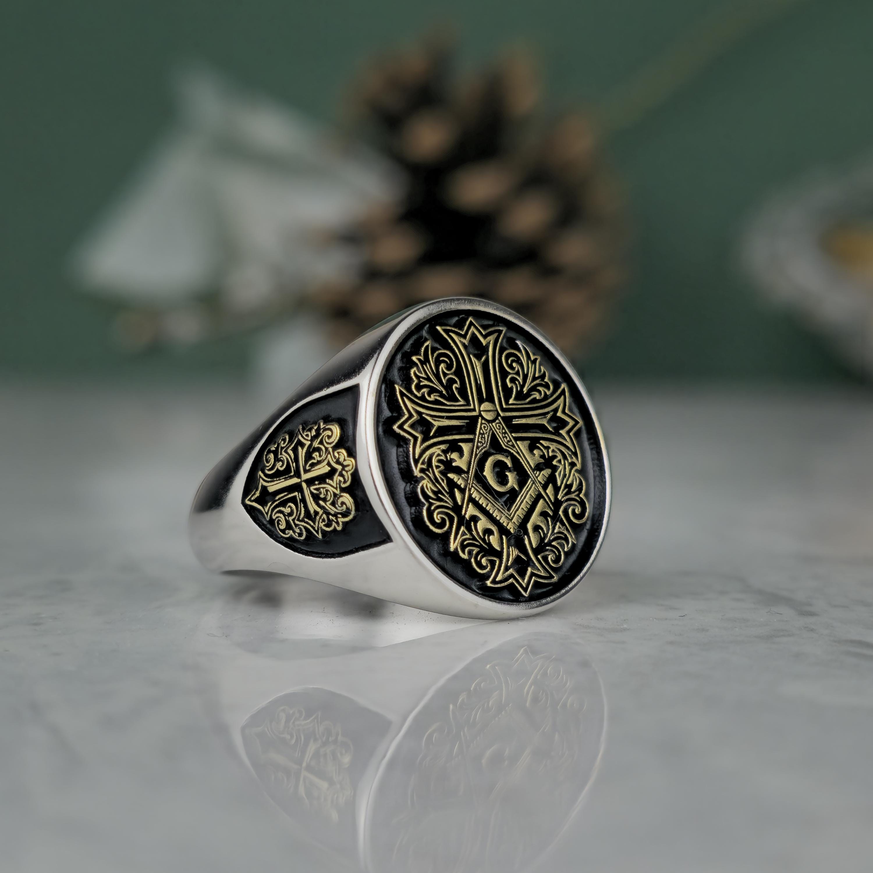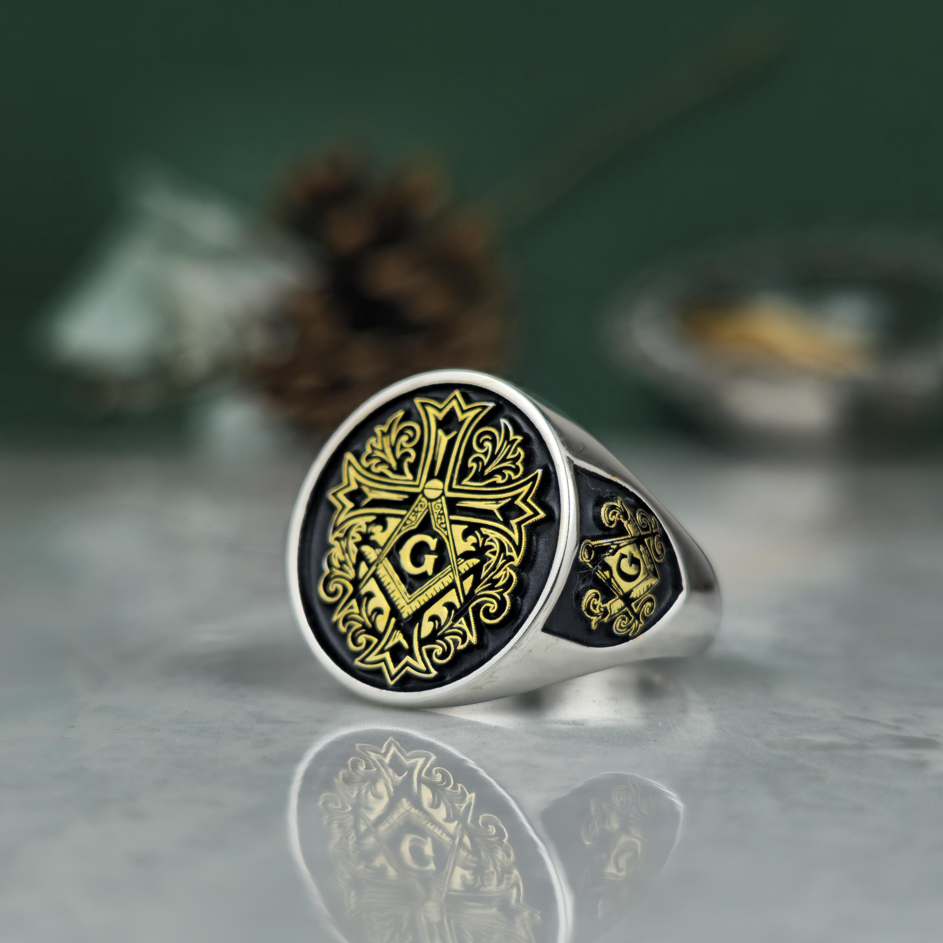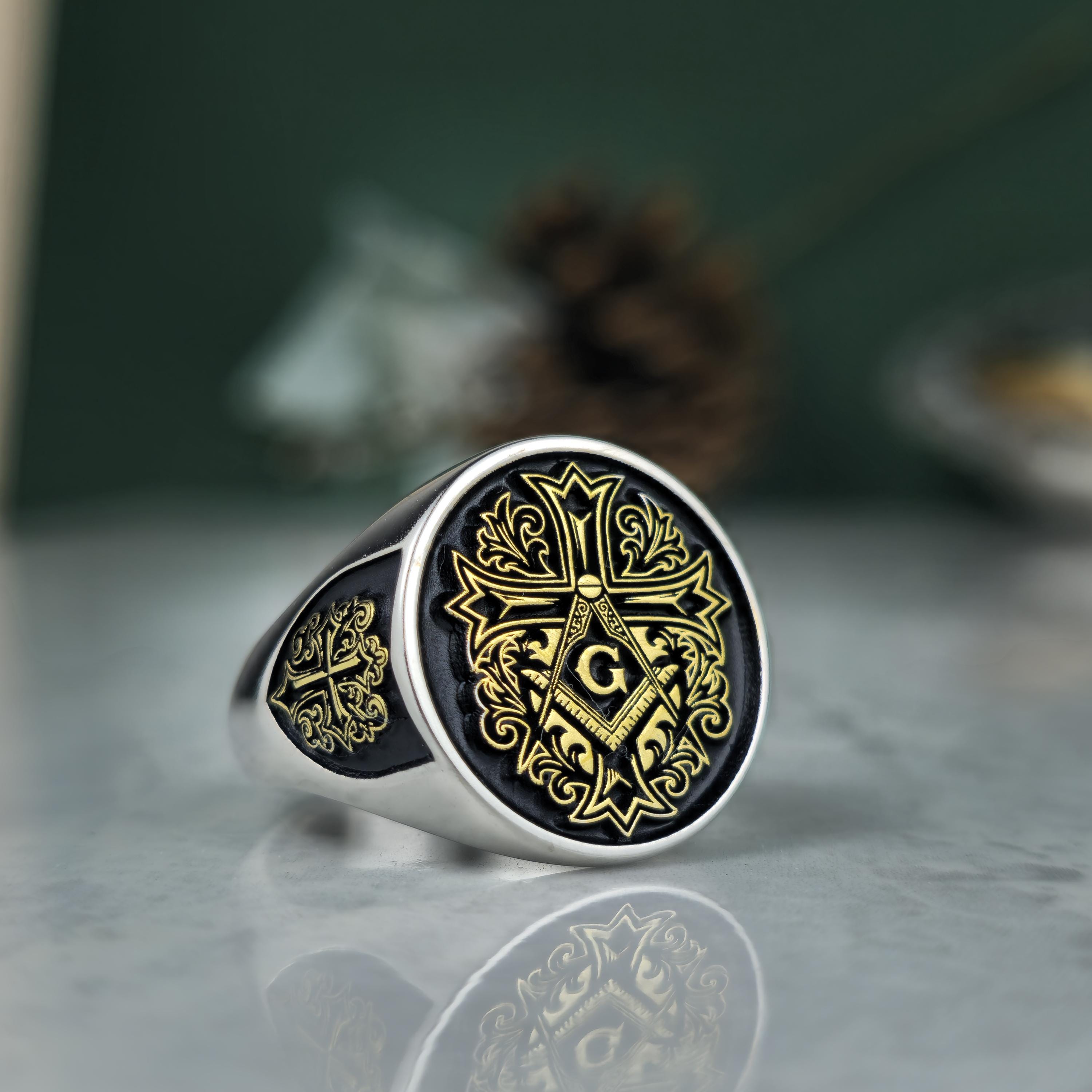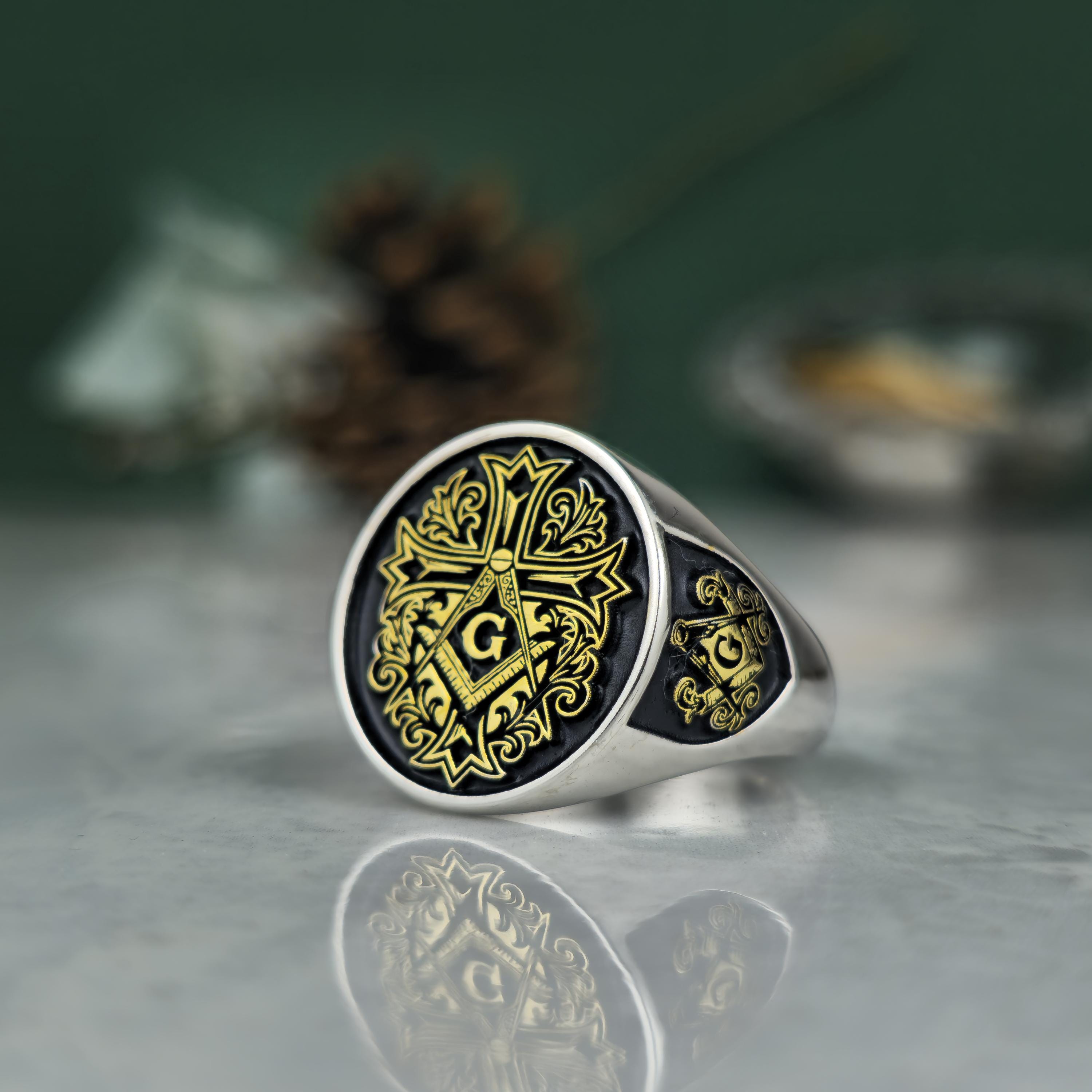 Royal Masonic Ring | Sterling Silver Freemason Signet Ring | Gold Tone Square Compass Cross Ring | Men's Symbolic Jewelry