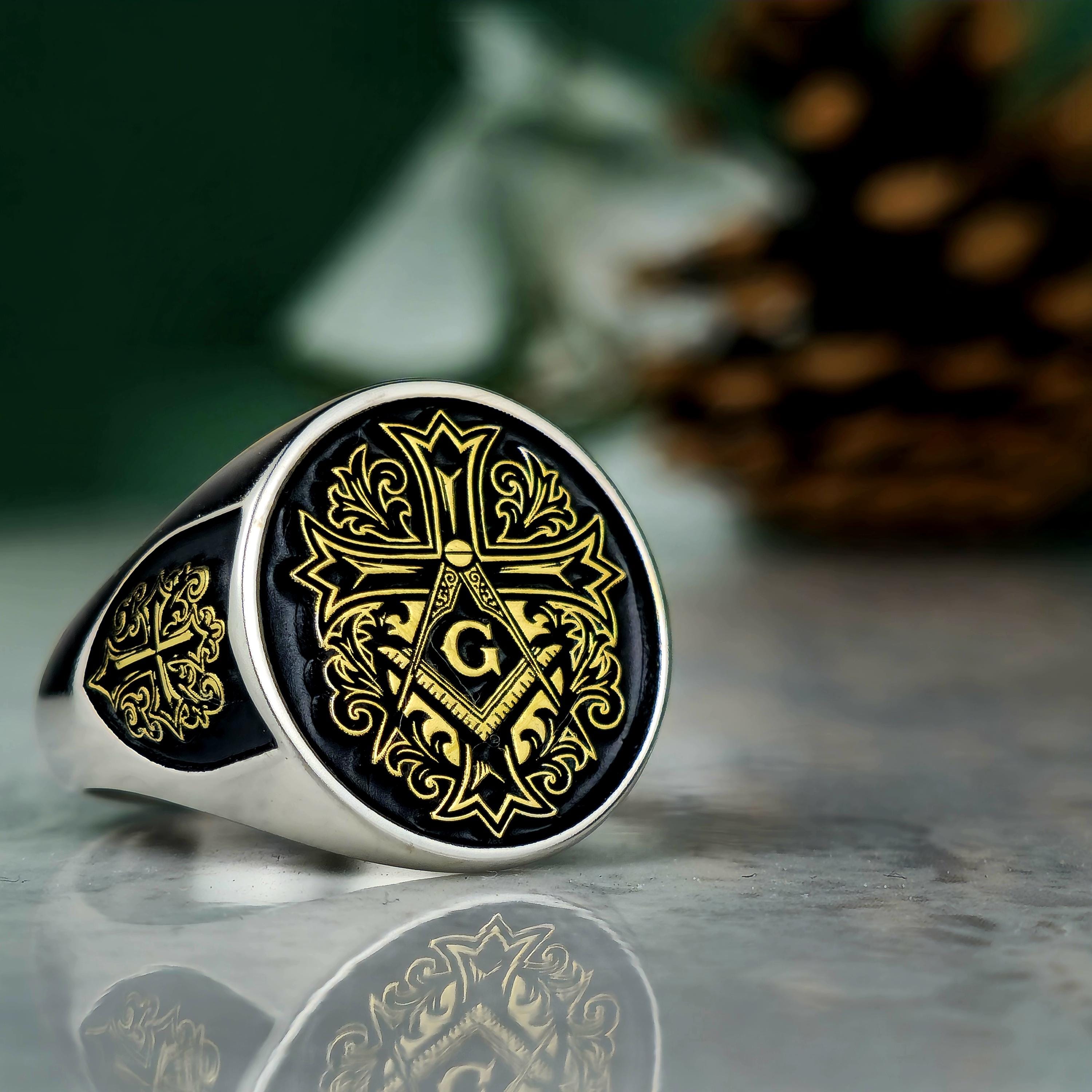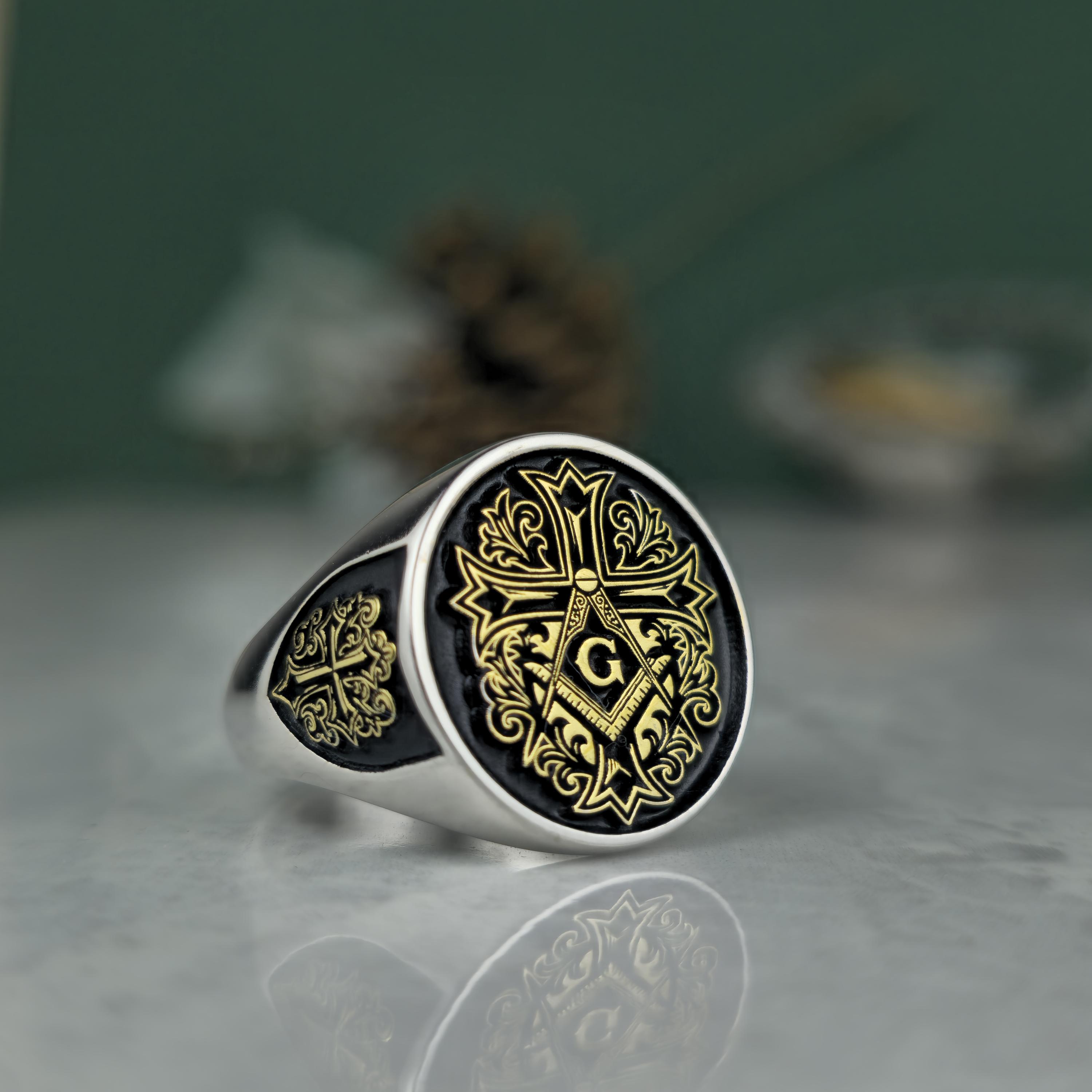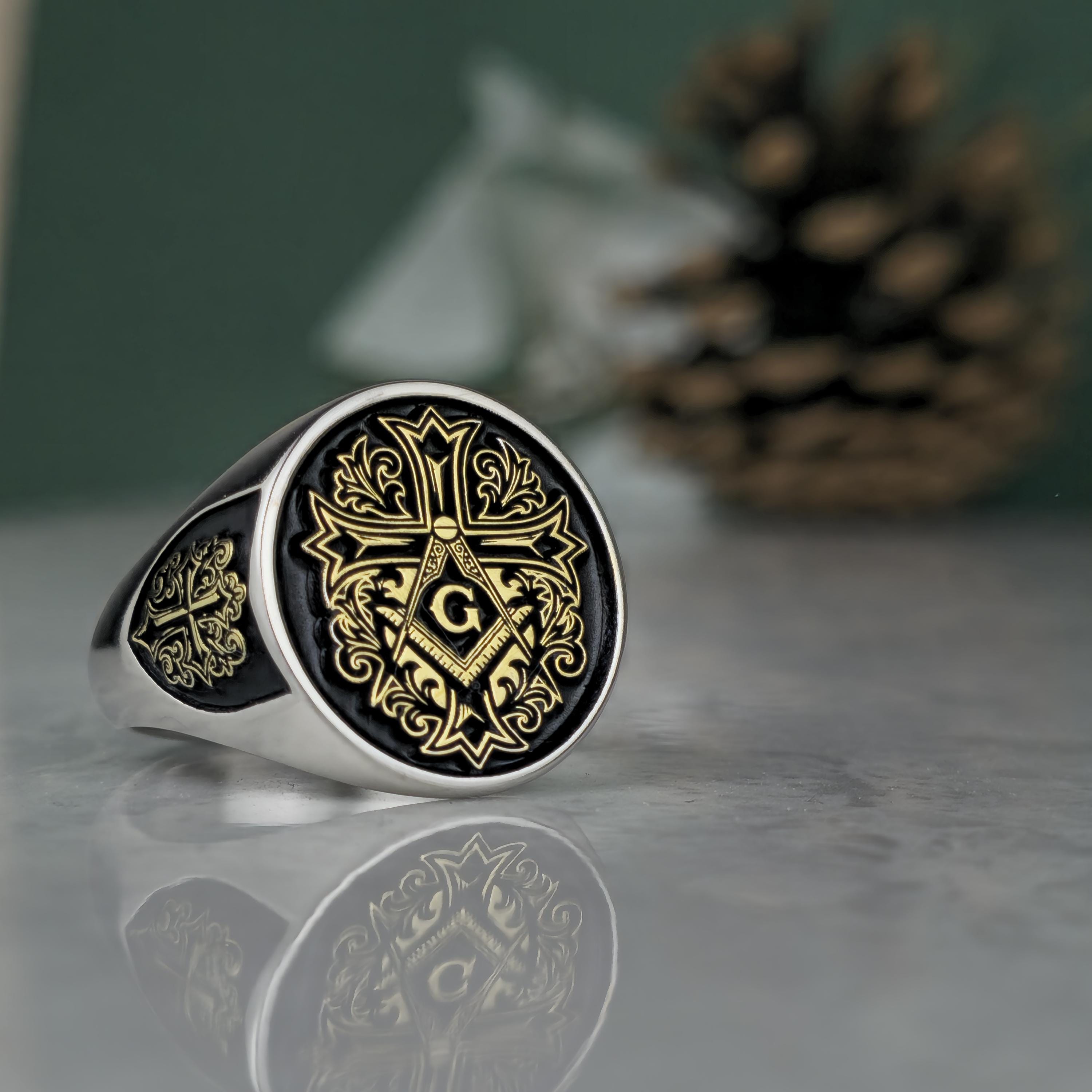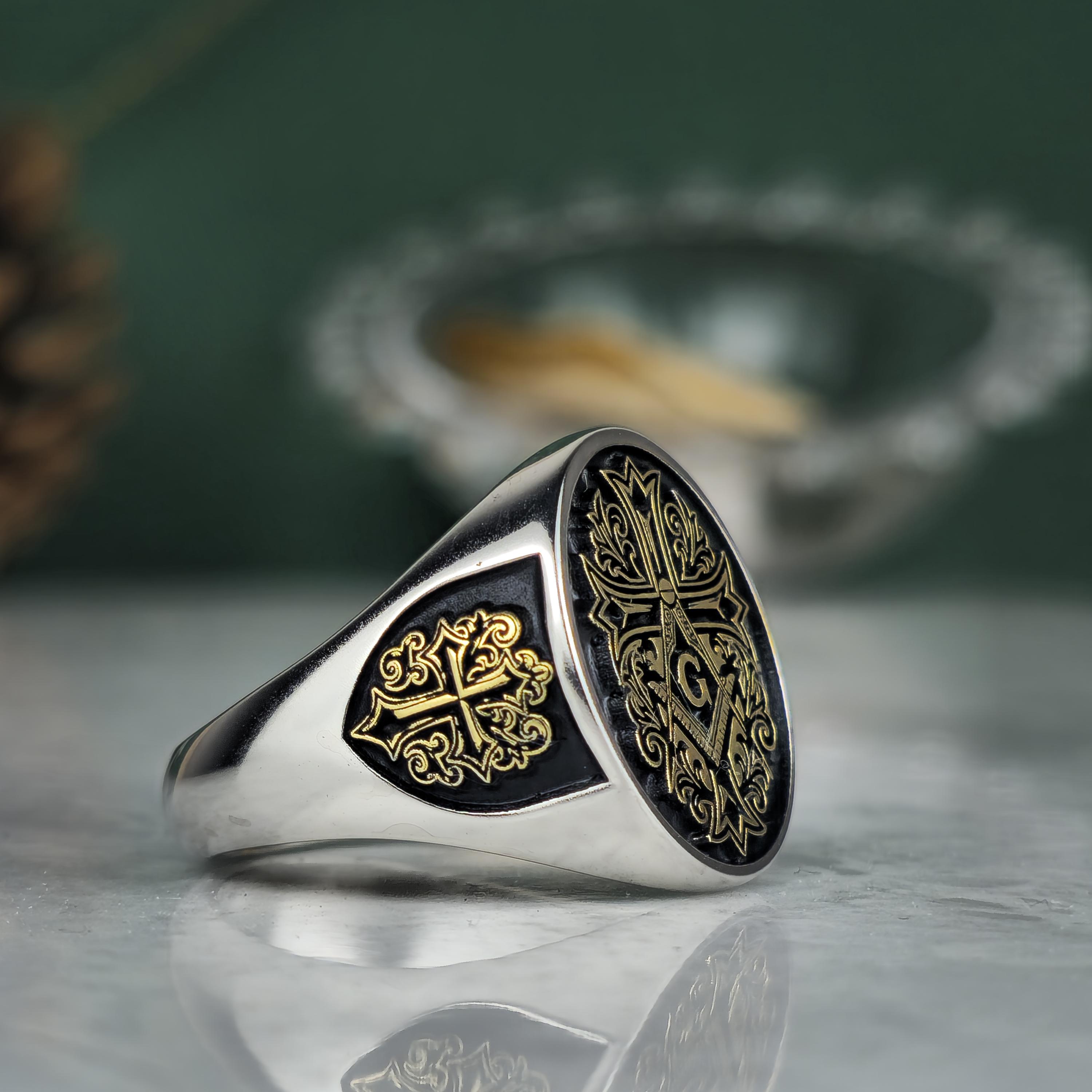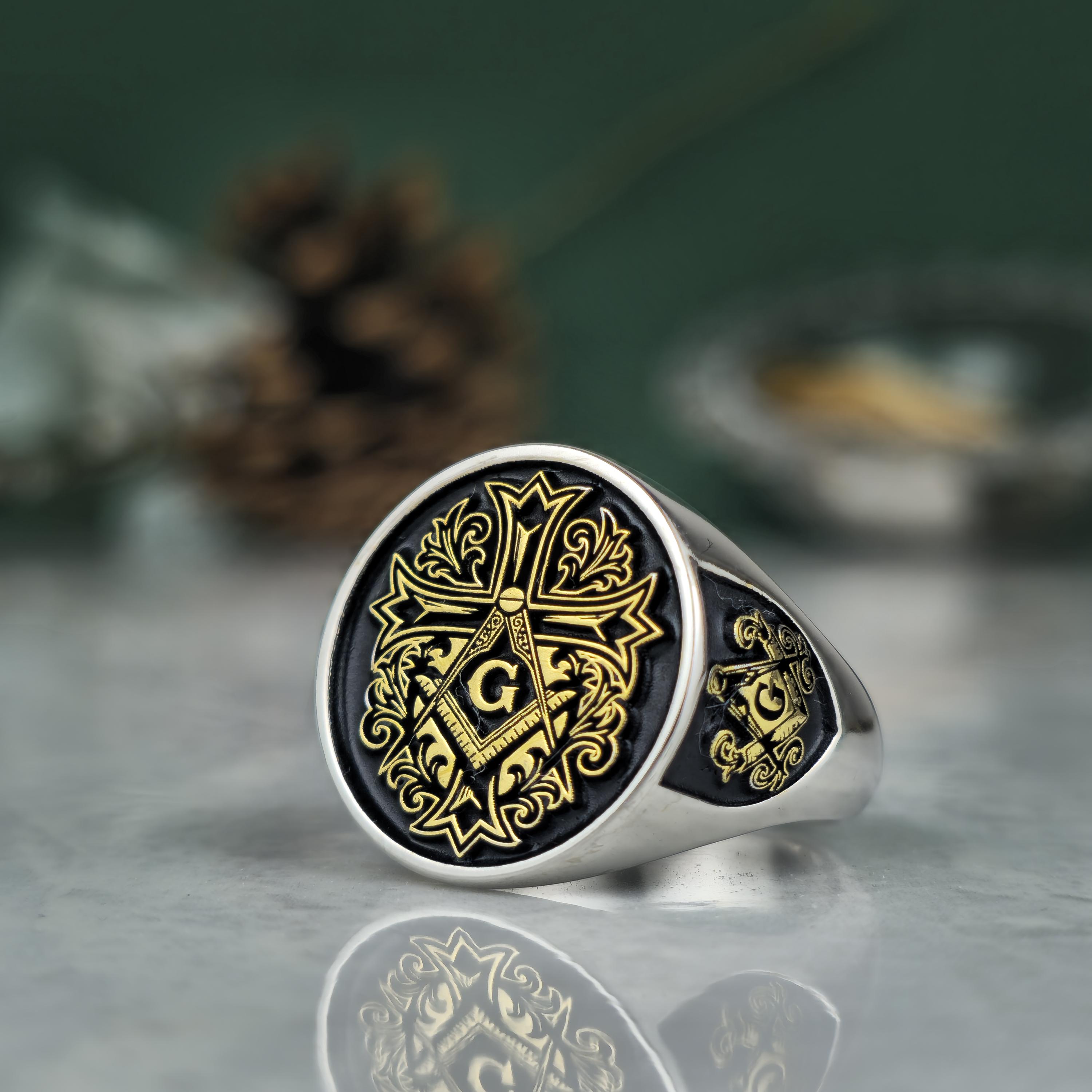 Royal Masonic Ring | Sterling Silver Freemason Signet Ring | Gold Tone Square Compass Cross Ring | Men's Symbolic Jewelry